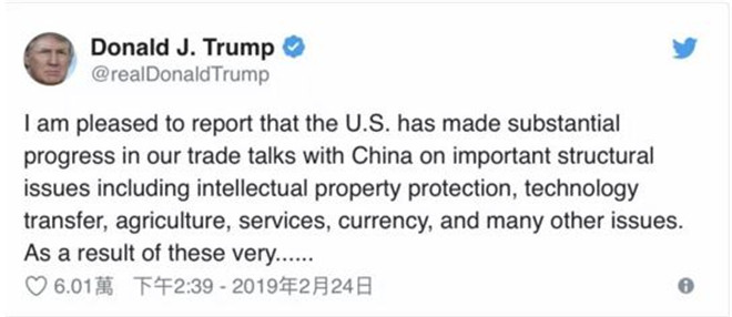 2019年2月24日,第七轮中美经贸高级别磋商结束,此次磋商在技术转让、知识产权保护、非关税壁垒等方面的具体问题上取得实质性进展。美国总统特朗普24日在推特上表示:美国将延后原定于3月1日对中国产品加征关税的措施。在随后的记者会上特朗普表示,如果一切顺利,在接下来的一到两周内事情将会取得突破性进展。